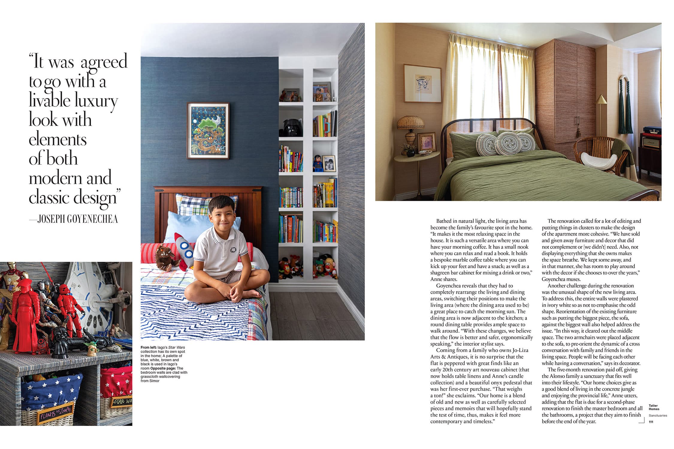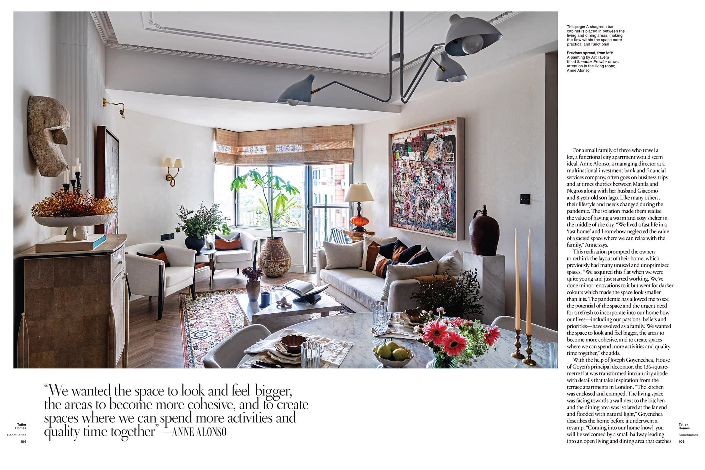 For the latest issue of Tatler Homes Philippines, I was commissioned to photograph the private residence of Anne Alonso, her husband and her son in Manila. It was isolation that “made them realise the value of having a warm and cosy shelter in the middle of the city.” As Anne explains, “We lived a fast life in a ‘fast home’ and I somehow neglected the value of a sacred space where we can relax with the family.” This realization prompted prompted the family to rethink the layout of their home. “The pandemic has allowed me to see the potential of the space and the urgent need for a refresh to incorporate into our home how our lives — including our passions, beliefs and priorities — have evolved as a family. We wanted the space to look and feel bigger, the areas to become more cohesive, and to create spaces where we can spend more activities and quality time together.” So, with the assistance of House of Goyen’s principal decorator, Joseph Goyenechea,”the 156-square-metre flat was transformed into an airy abode with details that take inspiration from the terrace apartments in London.” Anne shares, “Our home is a blend of old and new as well as carefully selected pieces and memoirs that will hopefully stand the test of time, thus, makes it feel more contemporary and timeless.”