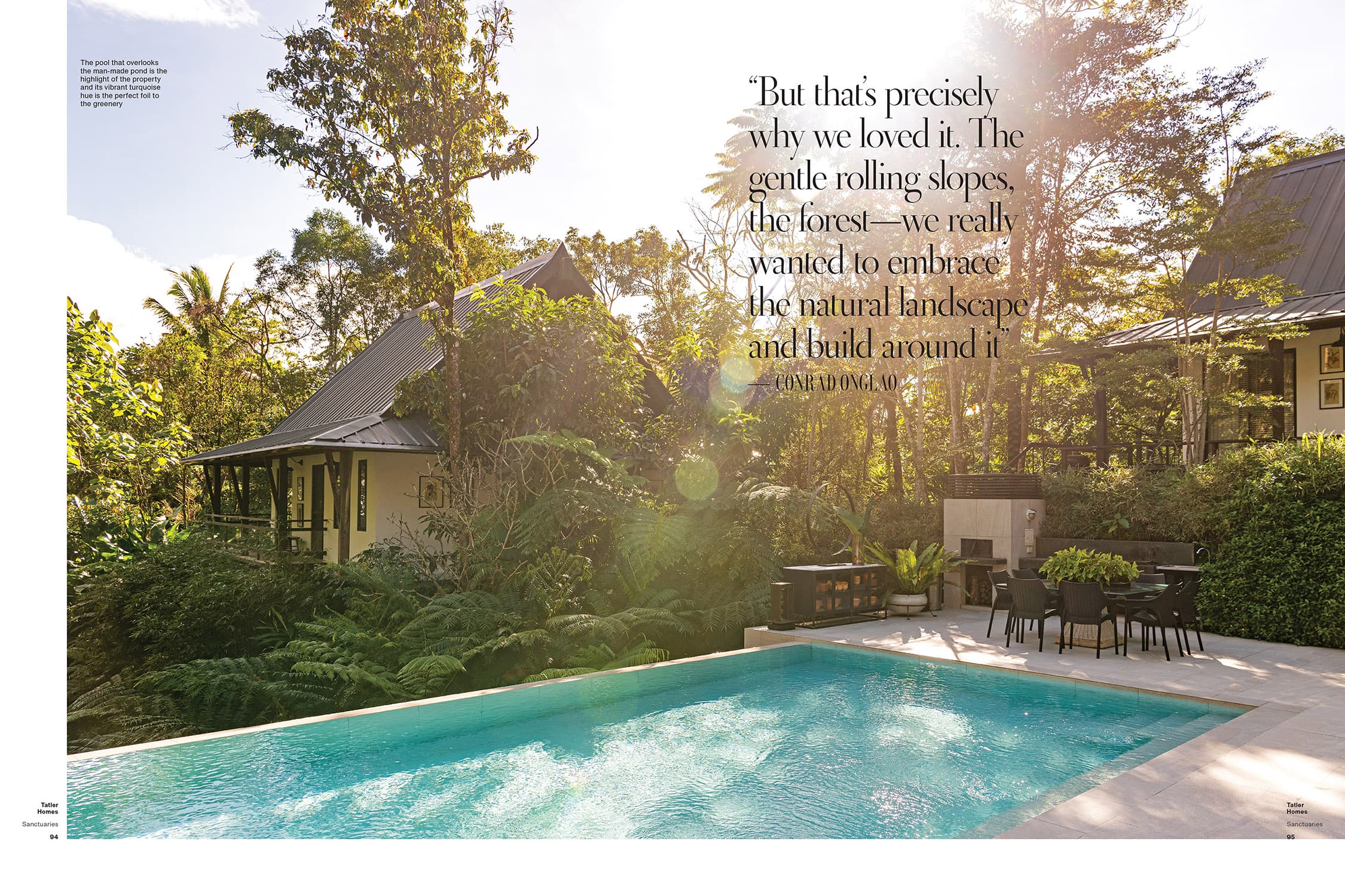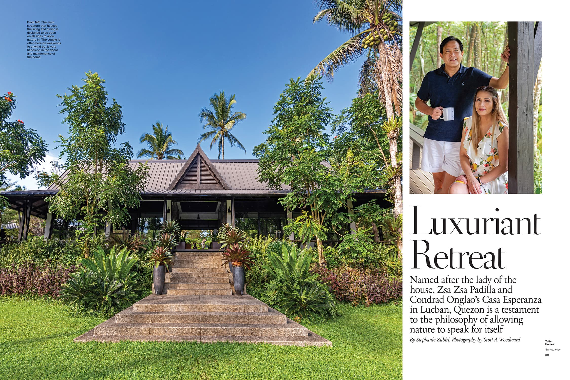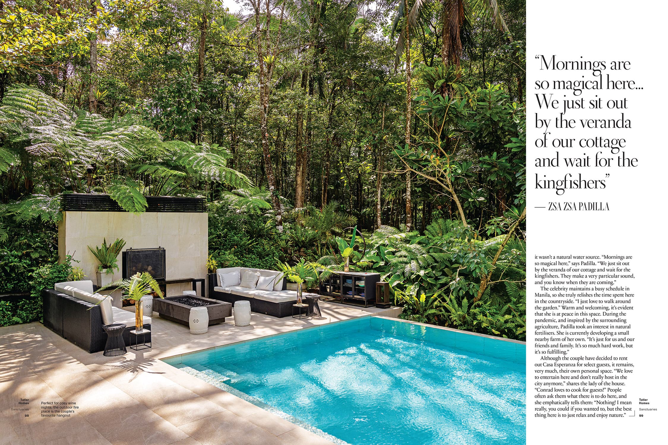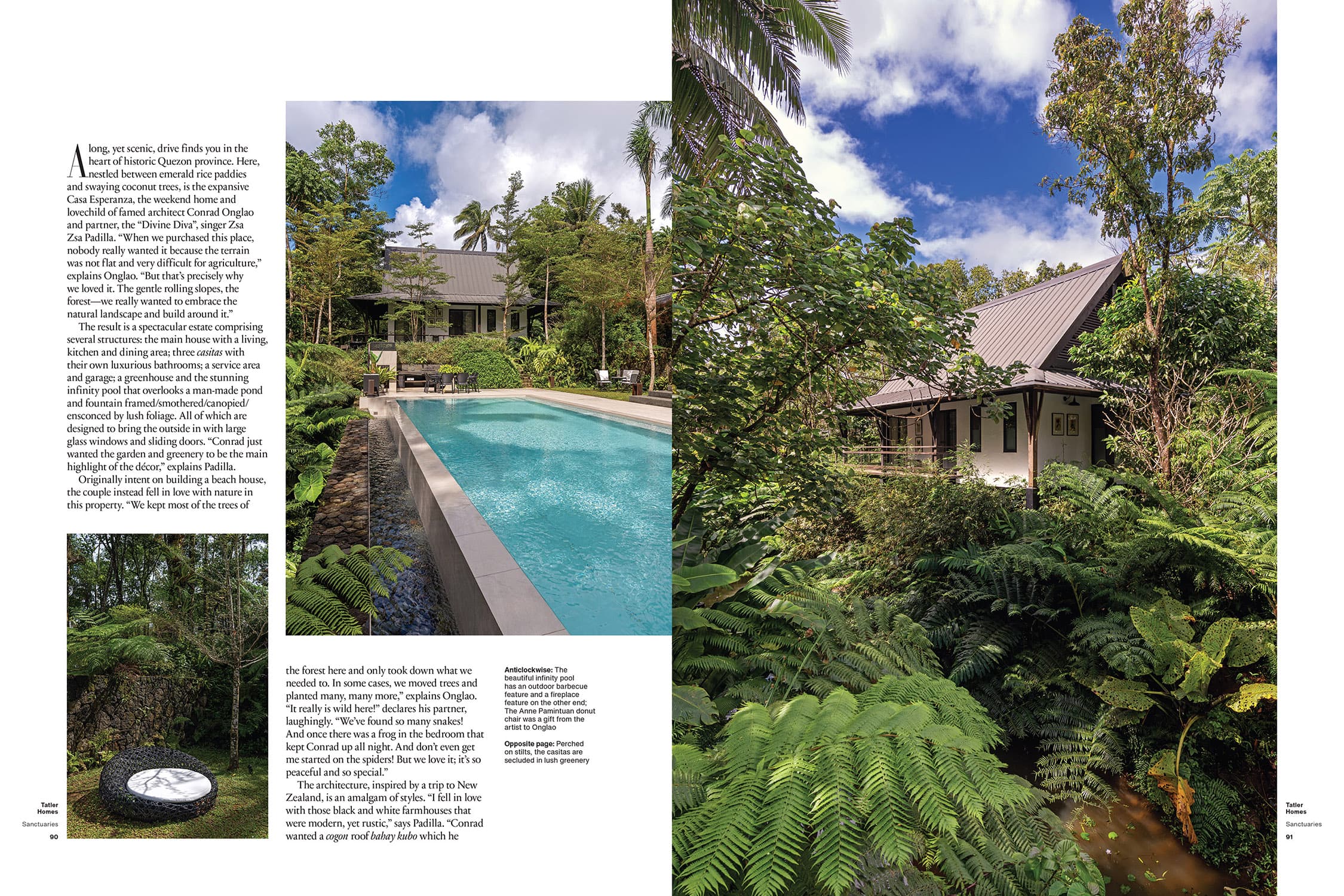 The latest issue of Tatler Homes Philippines is all about that “Great Escape” and — as Stephanie Zubiri expresses in her Letter From the Editor — no matter how we define or seek this, “solace is within reach”. My assignment for this issue was to photograph Casa Esperanza, “architect Conrad Onglao and singer Zsa Zsa Padilla’s lush weekend retreat in Lucban, Quezon.” As I learned while spending a wonderful day with them, “ensconced by lush foliage”, gazing at an “infinity pool that overlooks a man-made pond and fountain” all surrounded by “gentle rolling slopes” it was clear that the duo had succeeded in delivering on their vision: “we really wanted to embrace the natural landscape and build around it…[and] bring the outside in”.