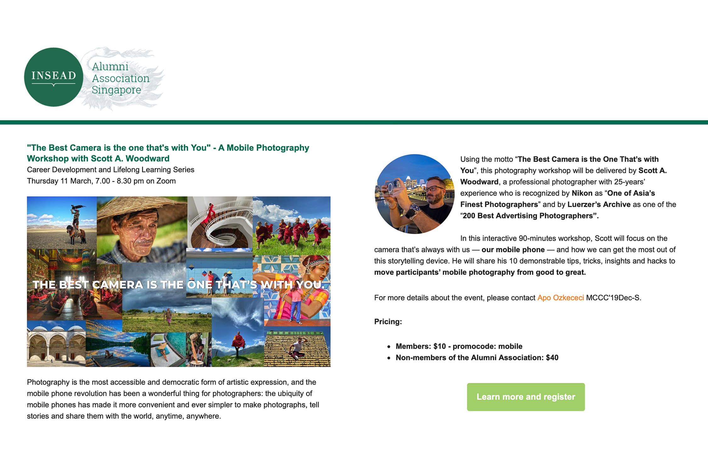 Using my journey as a photographer as the basis for this presentation — from my business education in Canada, to my decade working in marketing and branding for Coca-Cola and American Express in Asia, to my life-changing decision to leave the corporate world and follow my creative passions as a photographer for the past 17 years — this 45-minute intimate discussion explores how to harness and inspire creativity in our everyday lives through four key insights that I have learned and adapted into both my personal and professional life: