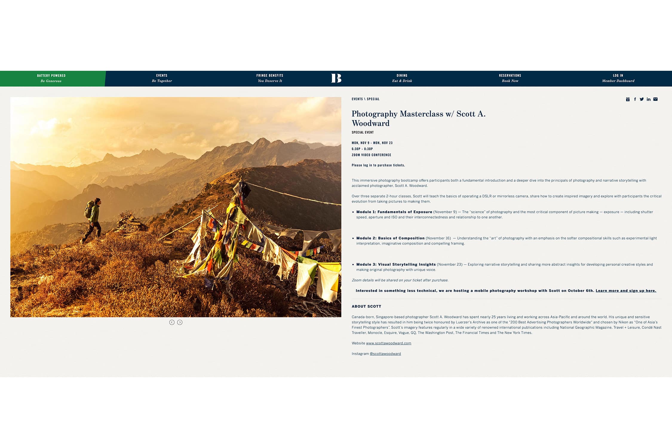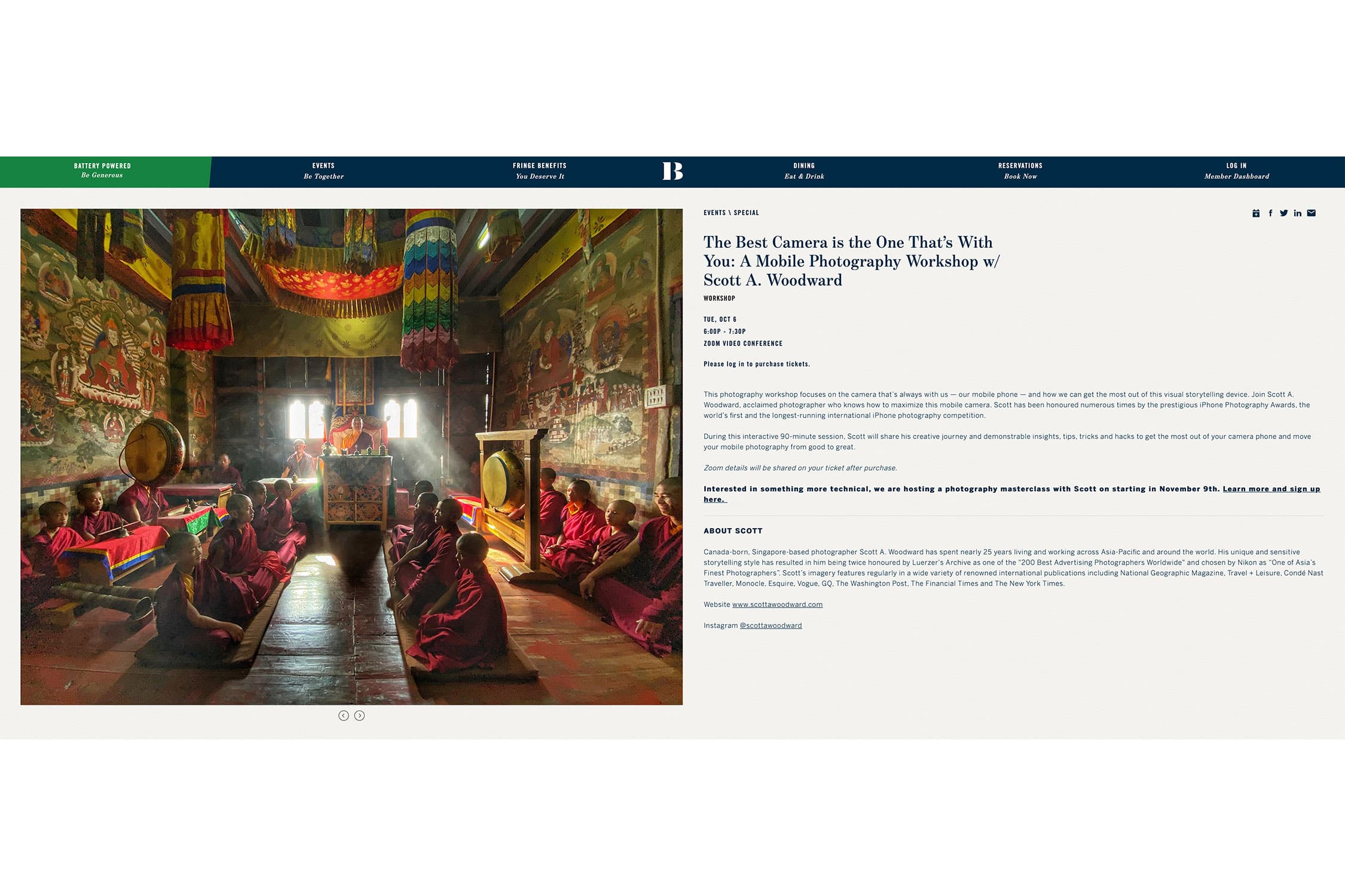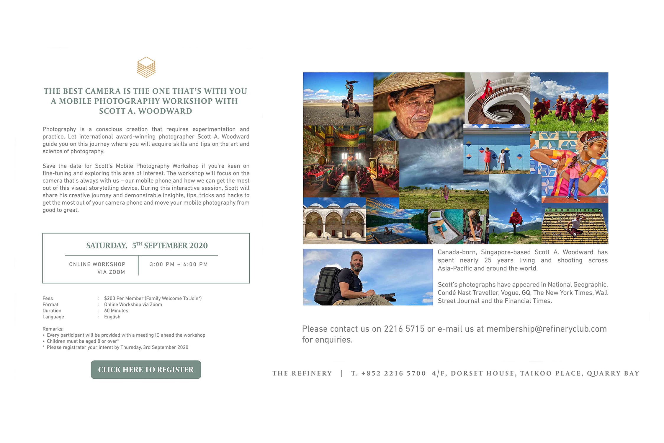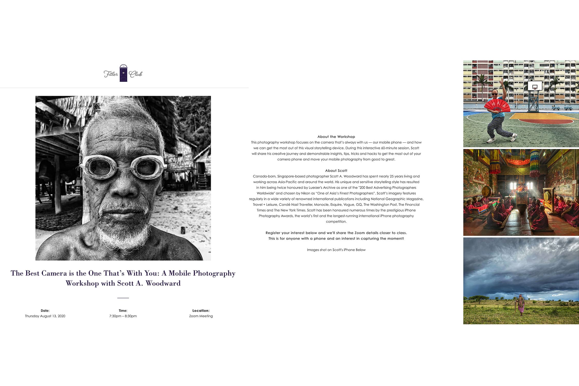 These experiences delivering online creativity talks, mobile photography classes and immersive instructional storytelling workshops for private clubs and corporations within the region and around the world has been a pivot that I didn’t expect. But it has provided me a platform in which to meet fellow photography enthusiasts while engaging partners’ staff and customers in creative conversations, cascading and mastering a skill with them and encouraging “armchair adventure” during this unprecedented global environment. Following are brief overviews of the custom discussions and courses I have created and am currently delivering remotely to private club and corporate partners internationally.