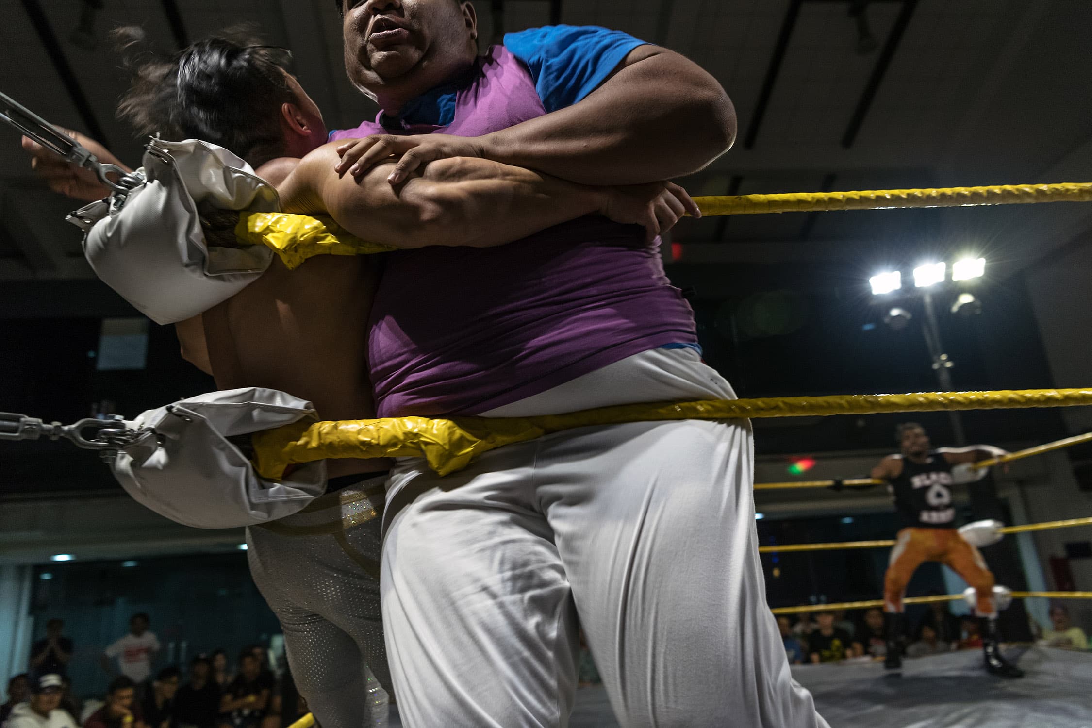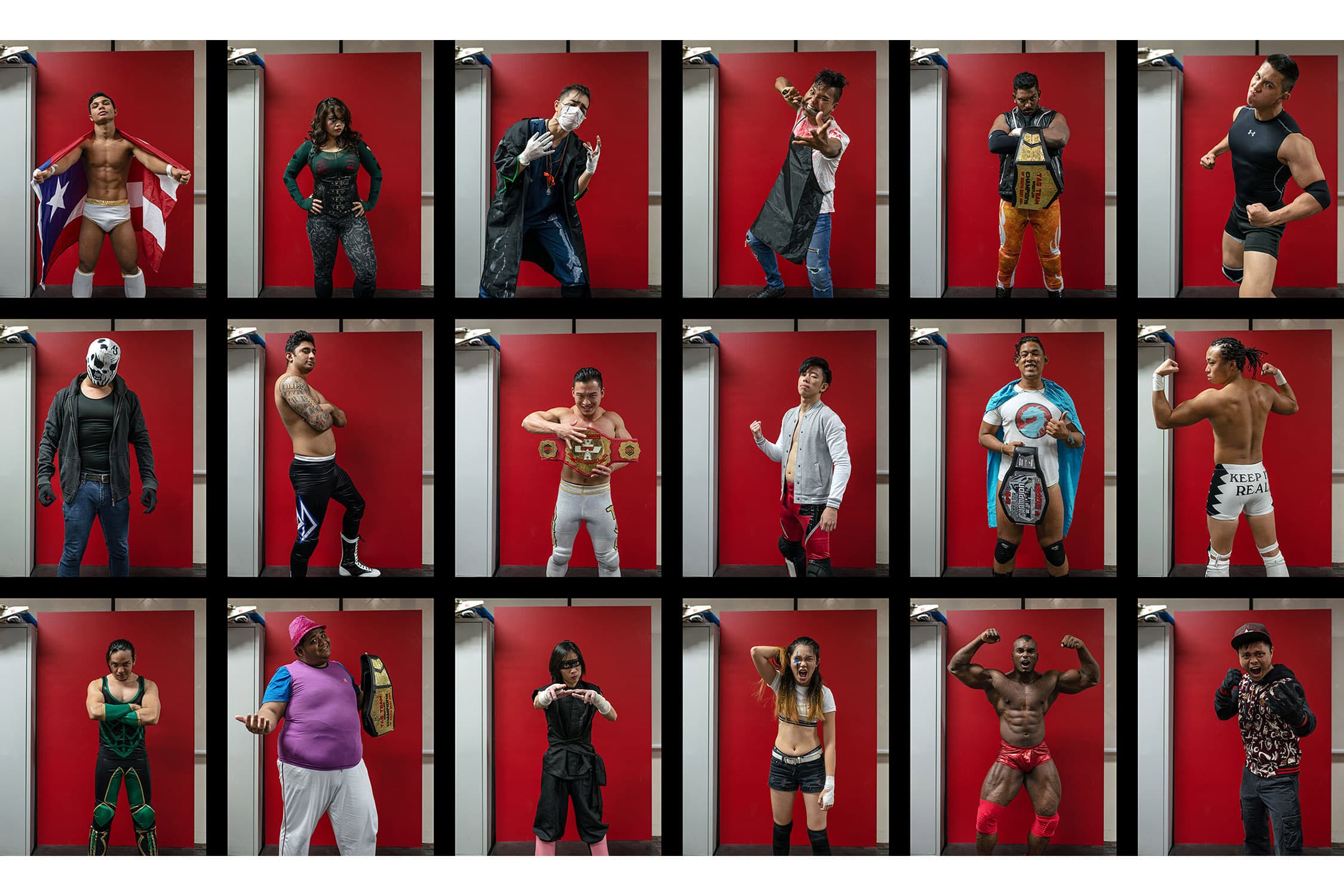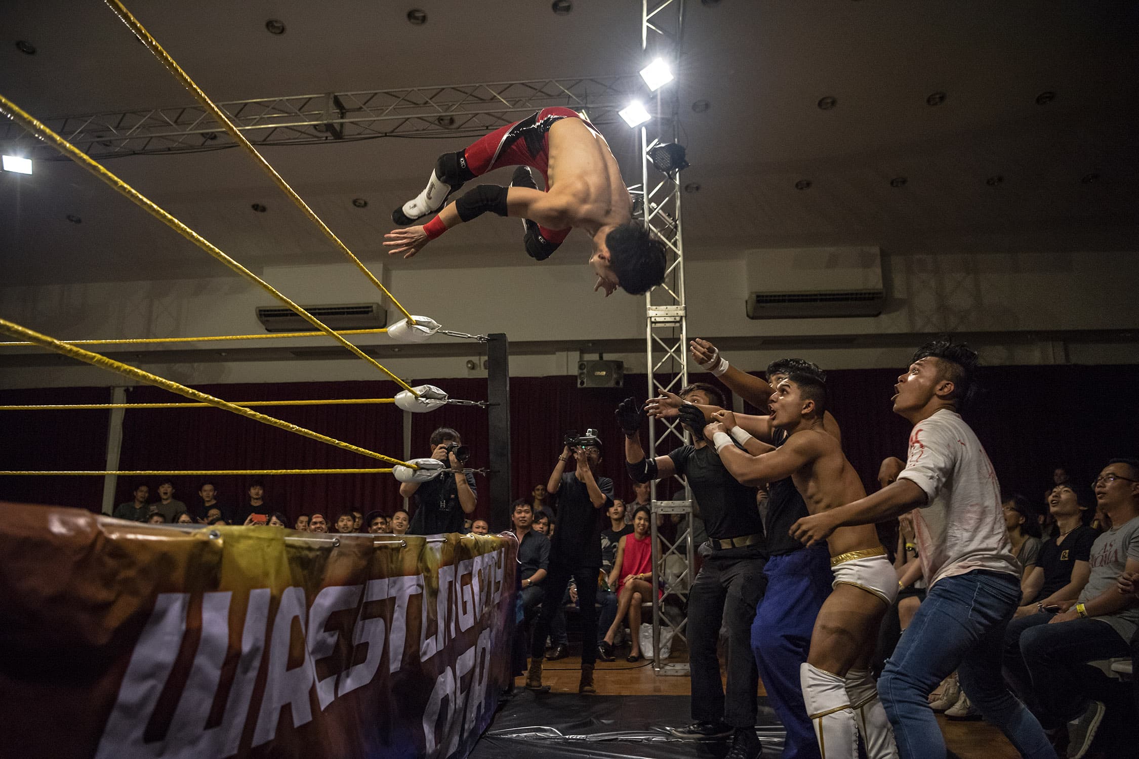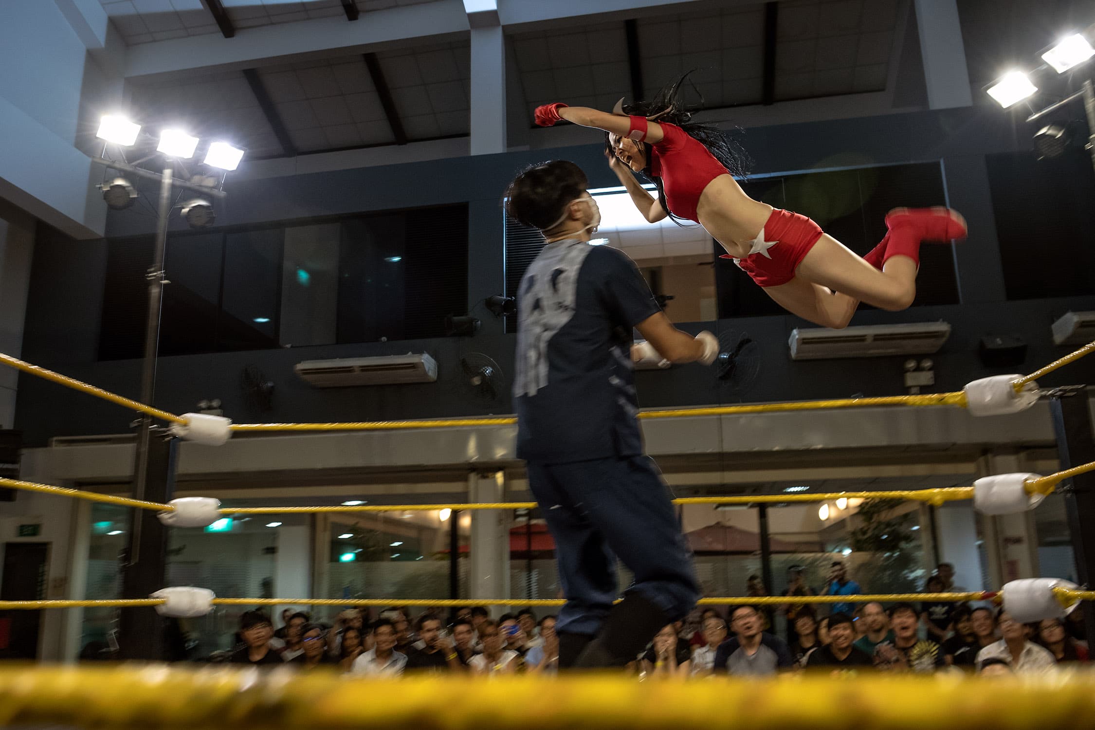 During several months spent documenting training and rehearsals at a cramped industrial estate, witnessing backstage preparations and the scrappy, energetic shows that followed, we discovered what drives these otherwise unassuming individuals, hailing from one of Asia’s most conservative countries, to don lycra and make-up and seek their 15 minutes of fame within the staged (but still, often blood-splattered and bone-shattering) spectacle of Singapore Pro Wrestling.