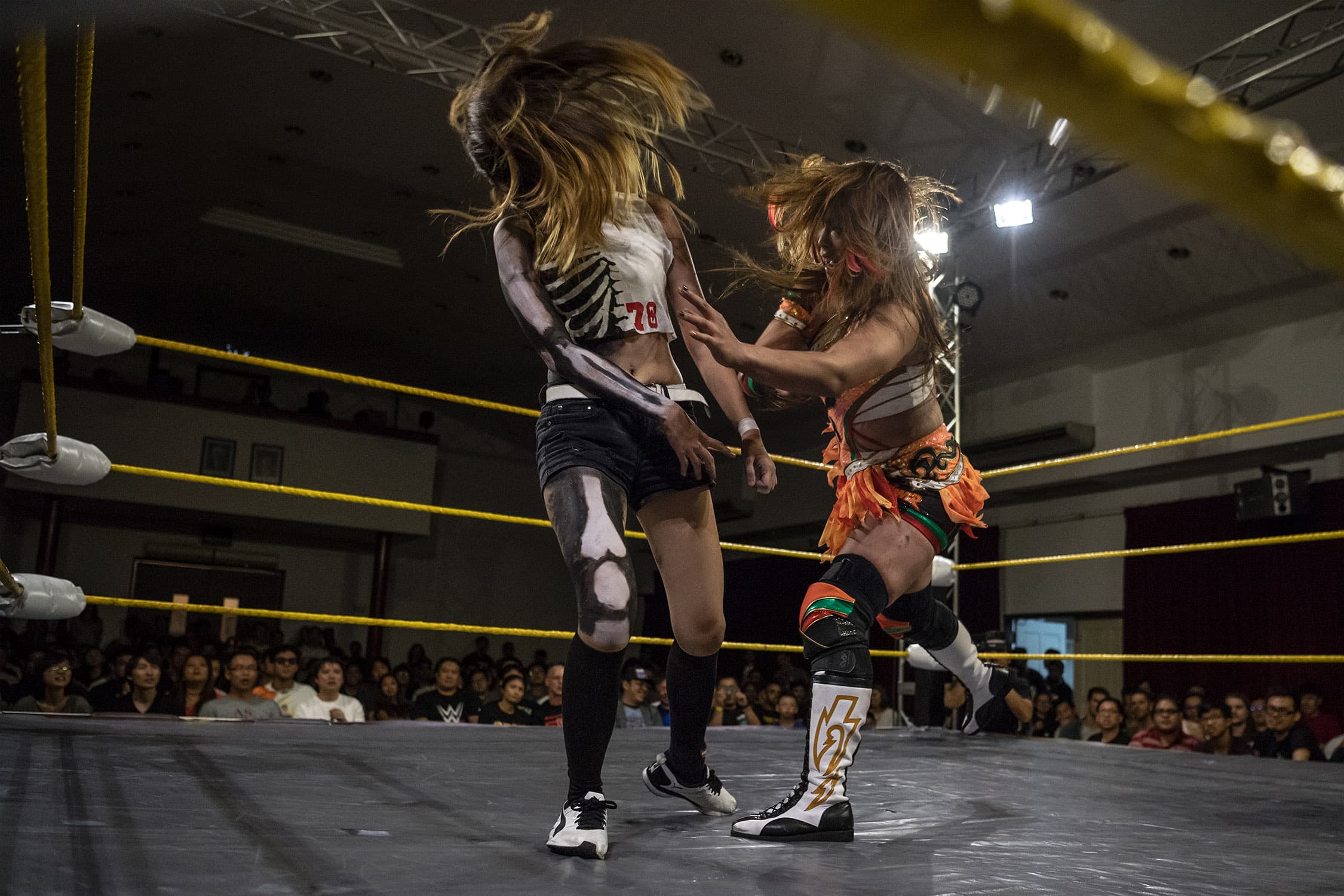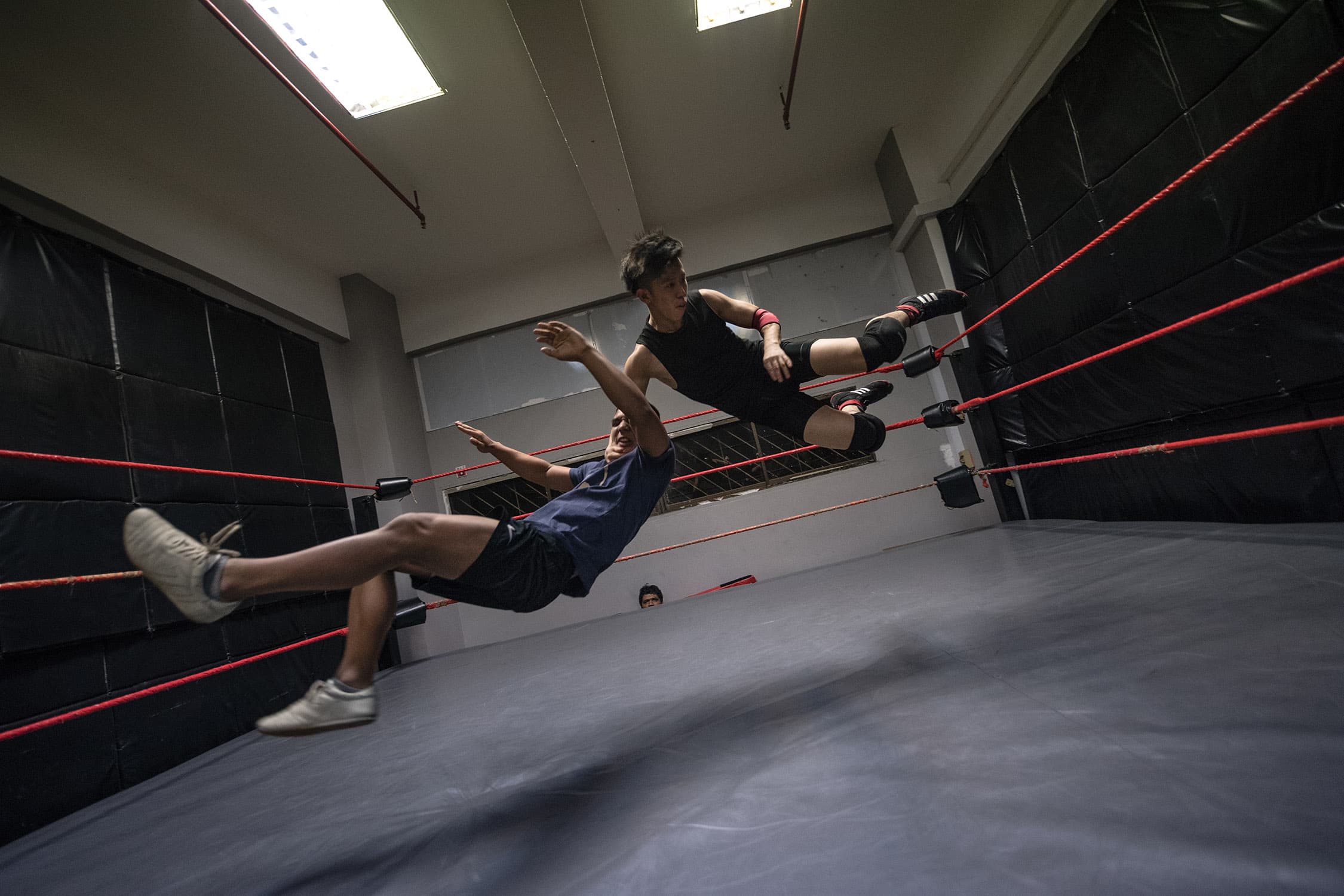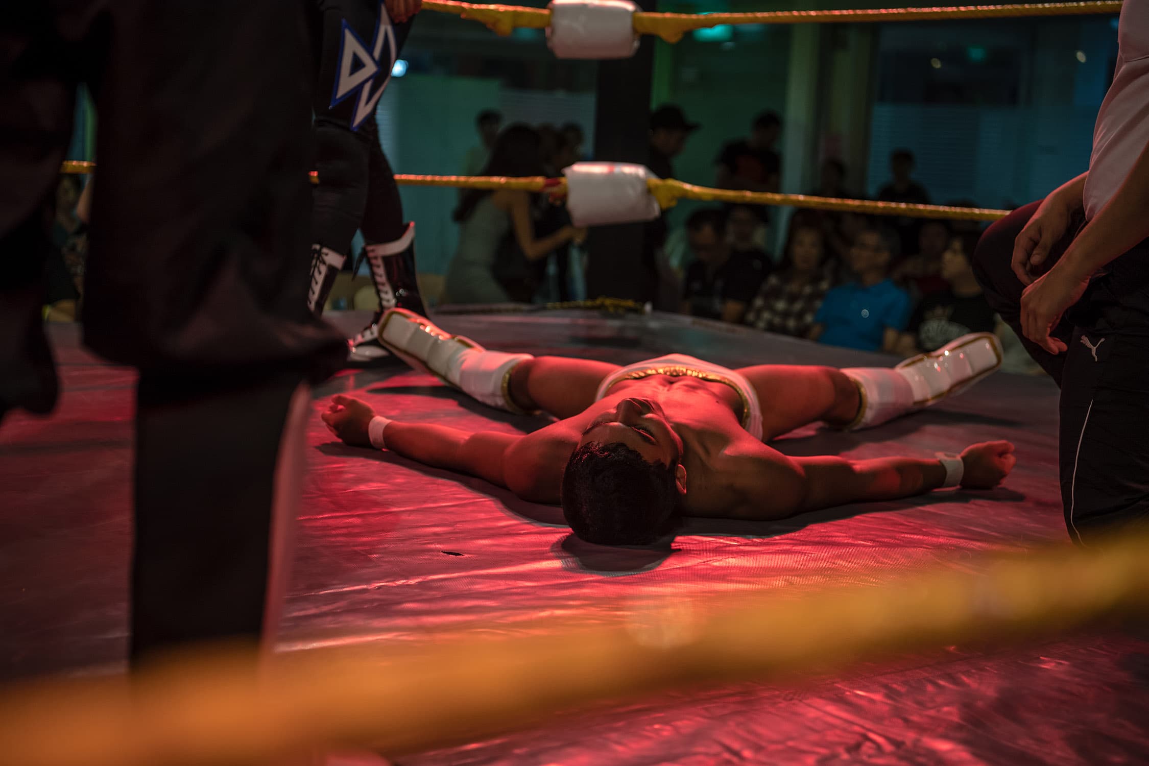 During several months spent documenting training and rehearsals at a cramped industrial estate, witnessing backstage preparations and the scrappy, energetic shows that followed, we discovered what drives these otherwise unassuming individuals, hailing from one of Asia’s most conservative countries, to don lycra and make-up and seek their 15 minutes of fame within the staged (but still, often blood-splattered and bone-shattering) spectacle of Singapore Pro Wrestling.