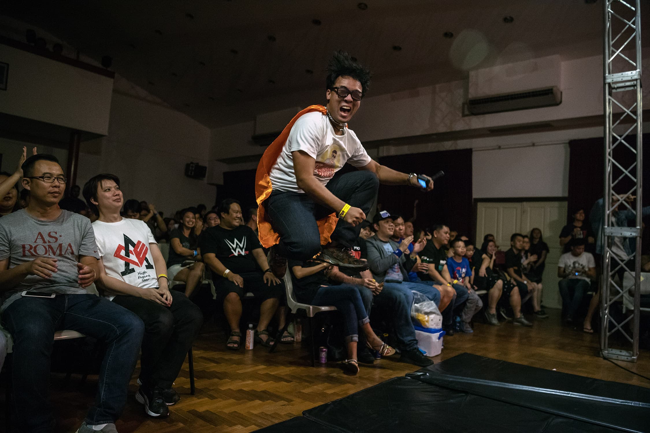 Performing in front of crowds of a few hundred fervent fans at small community centres on the city-state’s outskirts, most of SPW’s passionate participants — amateurs in the truest sense of the word — are ordinary Singaporeans who bear little physical resemblance to the stereotype of a professional wrestler. Instead, they’re everyday office workers of all body shapes and sizes who, strutting into the ring, transform into their theatrical alter egos — flamboyantly costumed, cartoon heroes and villains.