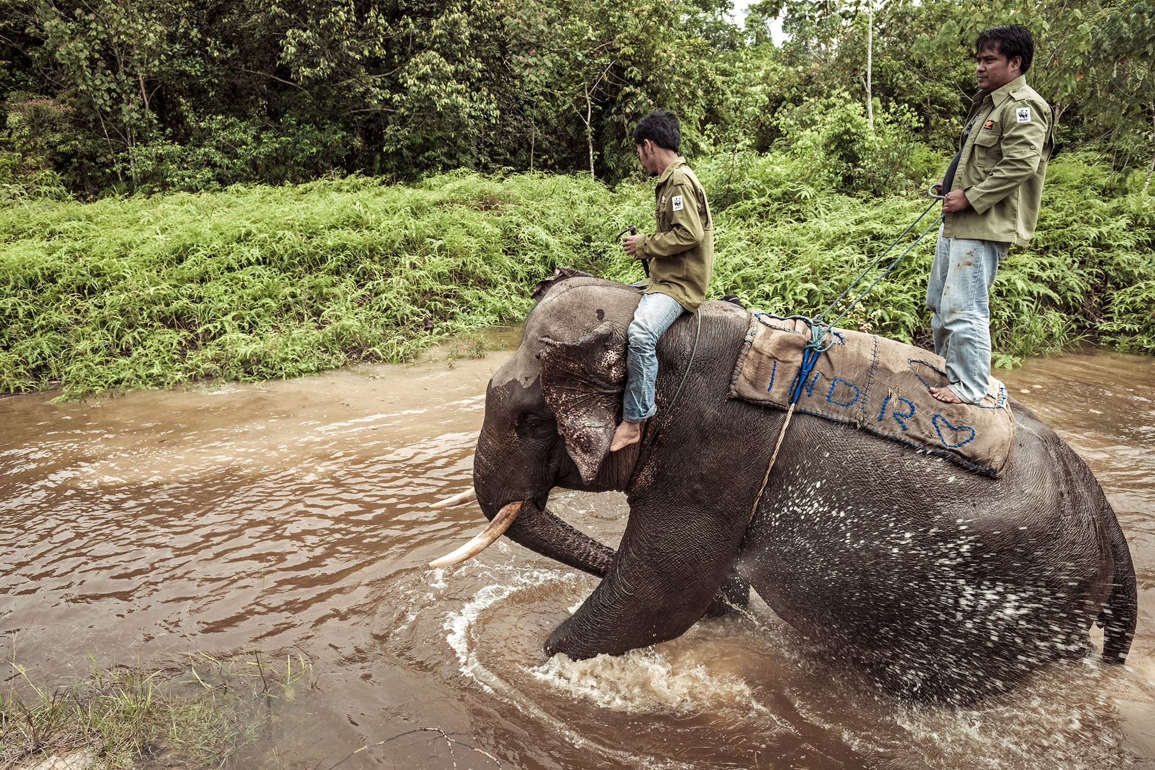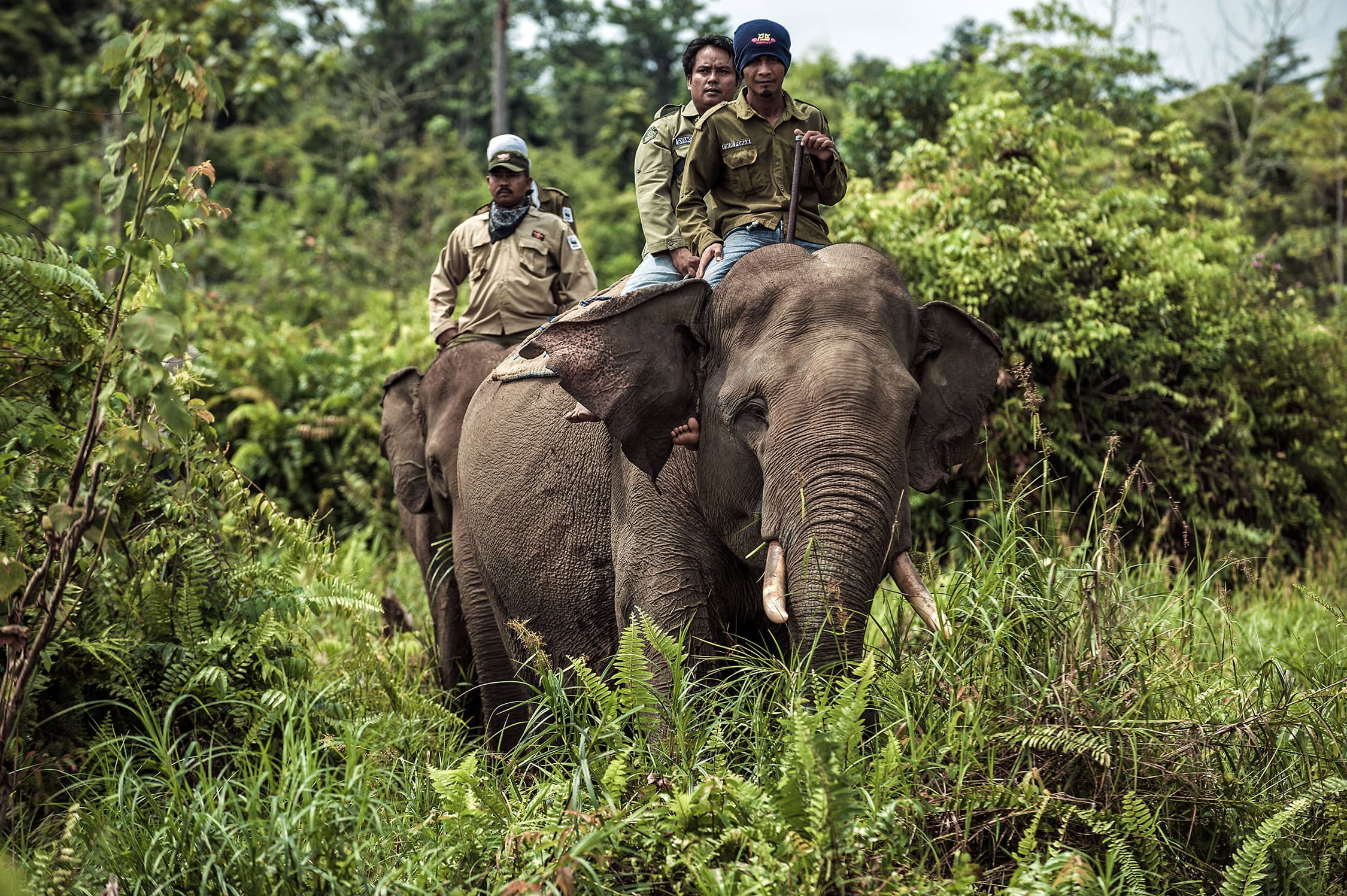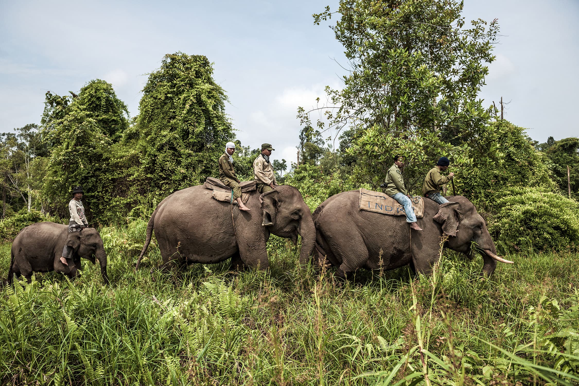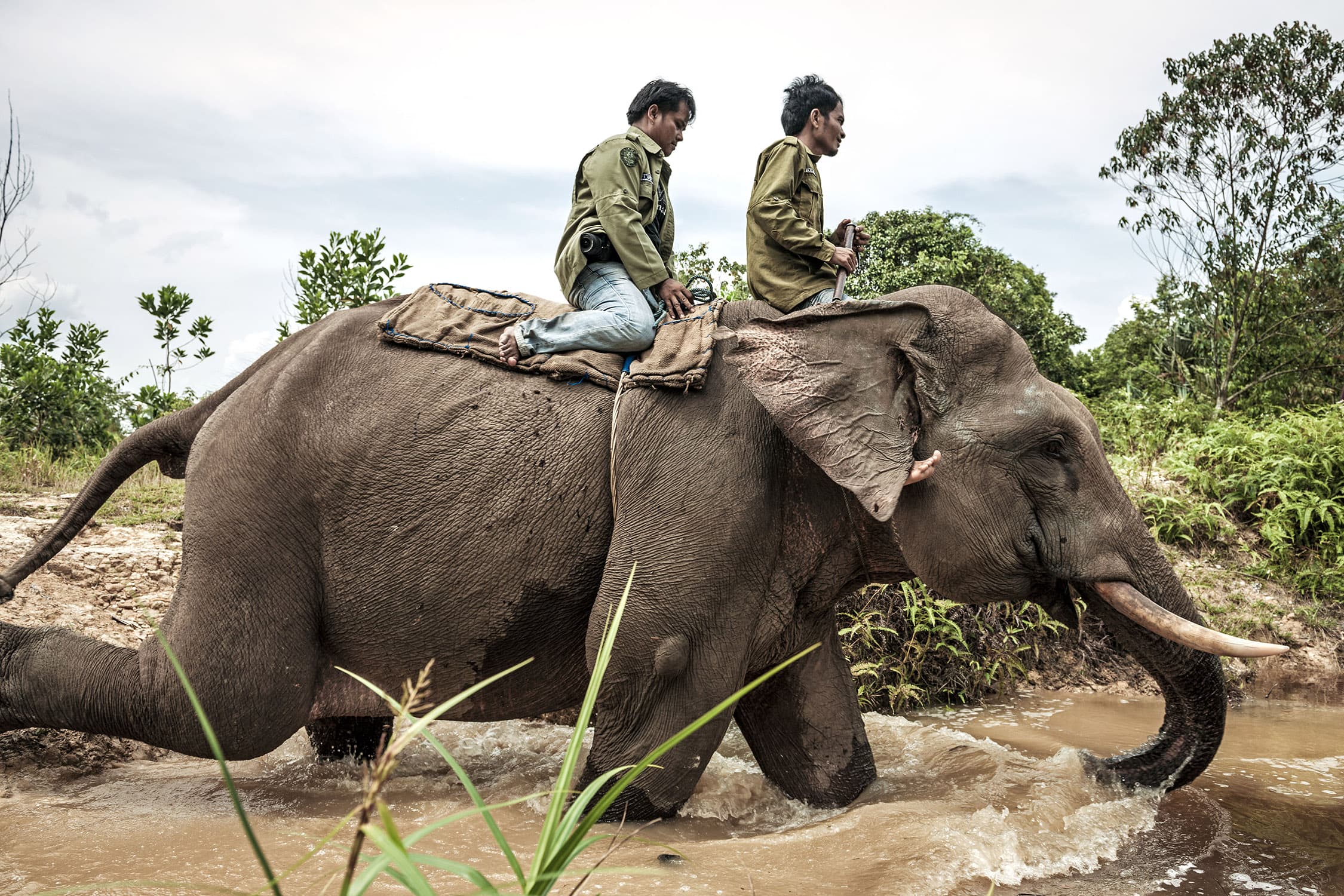 Deep inside the Indonesian rainforest of central Sumatra lives the Tesso Nilo Elephant Flying Squad. This group of seven domesticated elephants and their 11 specially trained mahouts are operated by the World Wildlife Fund (WWF) in collaboration with Indonesia’s Ministry of Forestry. The squad’s mission is to provide a secure haven for Riau Province’s largest remaining wild elephant population. Elephant numbers have declined in Riau from more than 1,600 in 1985 to as few as 350 today, about 150 of which live in Tesso Nilo National Park. By patrolling the fringes of the park, the squad helps prevent wild elephants from invading farms and villages — where they can cause immense damage and run the risk of being injured or killed by angry farmers and villagers — by carefully driving them back into the jungle. The Elephant Flying Squad is in constant battle to bring harmony to the local environment by mitigating human-elephant conflict. And, so far, this supersize security patrol appears to be winning.