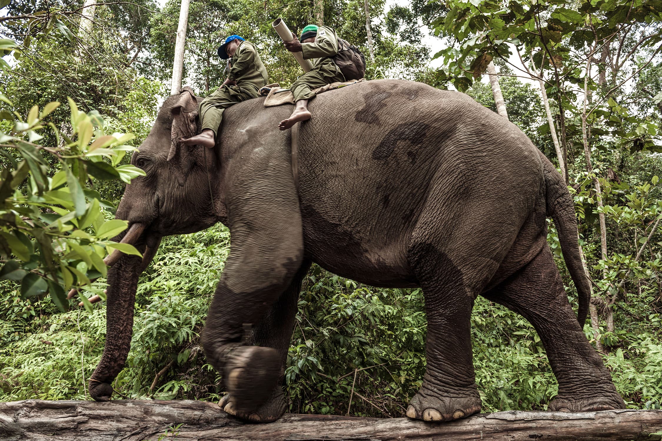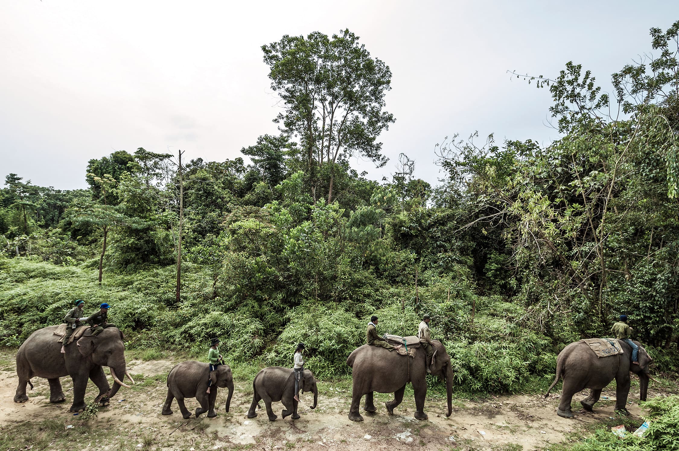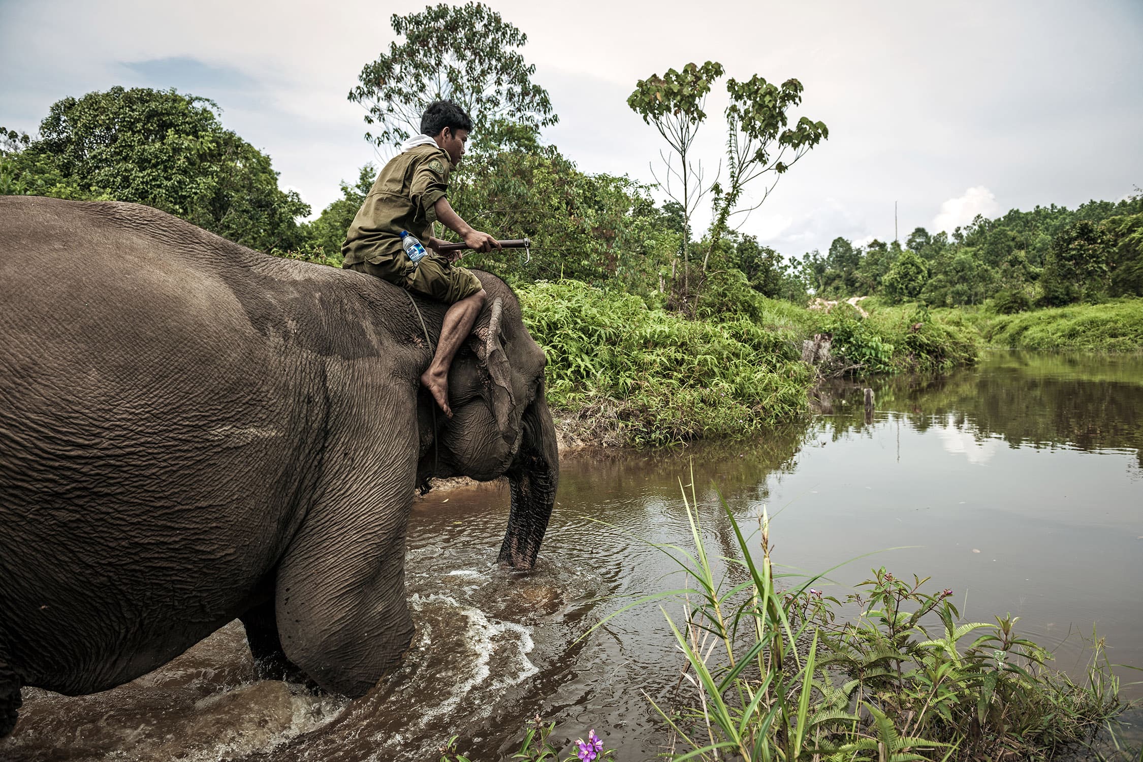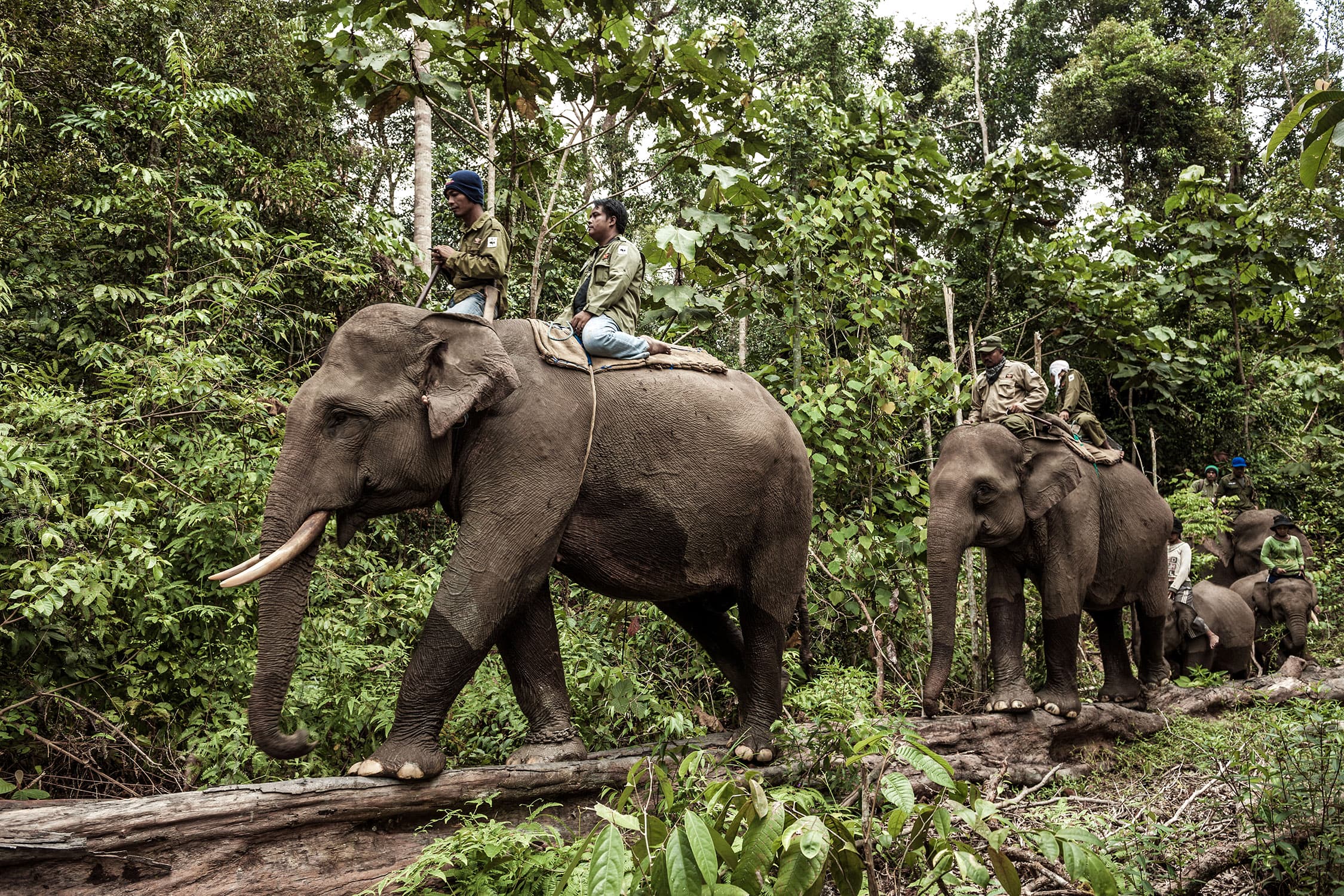 Deep inside the Indonesian rainforest of central Sumatra lives the Tesso Nilo Elephant Flying Squad. This group of seven domesticated elephants and their 11 specially trained mahouts are operated by the World Wildlife Fund (WWF) in collaboration with Indonesia’s Ministry of Forestry. The squad’s mission is to provide a secure haven for Riau Province’s largest remaining wild elephant population. Elephant numbers have declined in Riau from more than 1,600 in 1985 to as few as 350 today, about 150 of which live in Tesso Nilo National Park. By patrolling the fringes of the park, the squad helps prevent wild elephants from invading farms and villages — where they can cause immense damage and run the risk of being injured or killed by angry farmers and villagers — by carefully driving them back into the jungle. The Elephant Flying Squad is in constant battle to bring harmony to the local environment by mitigating human-elephant conflict. And, so far, this supersize security patrol appears to be winning.