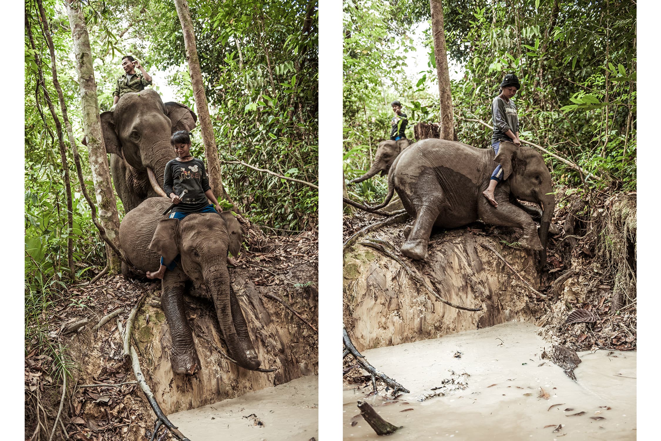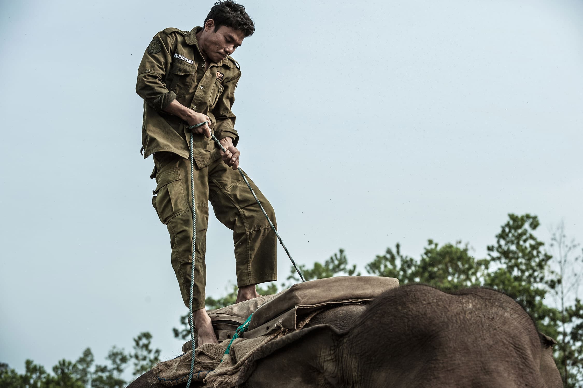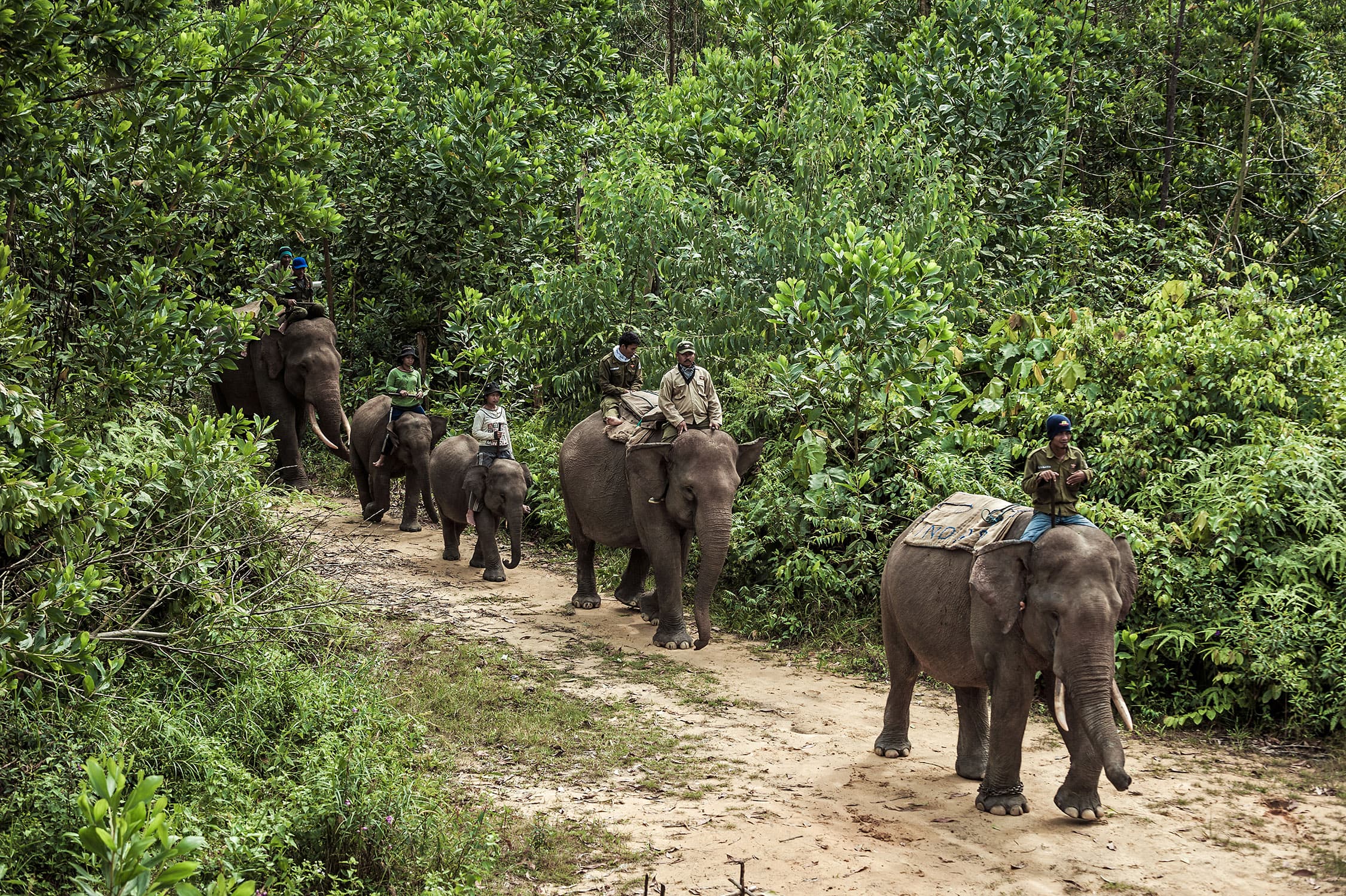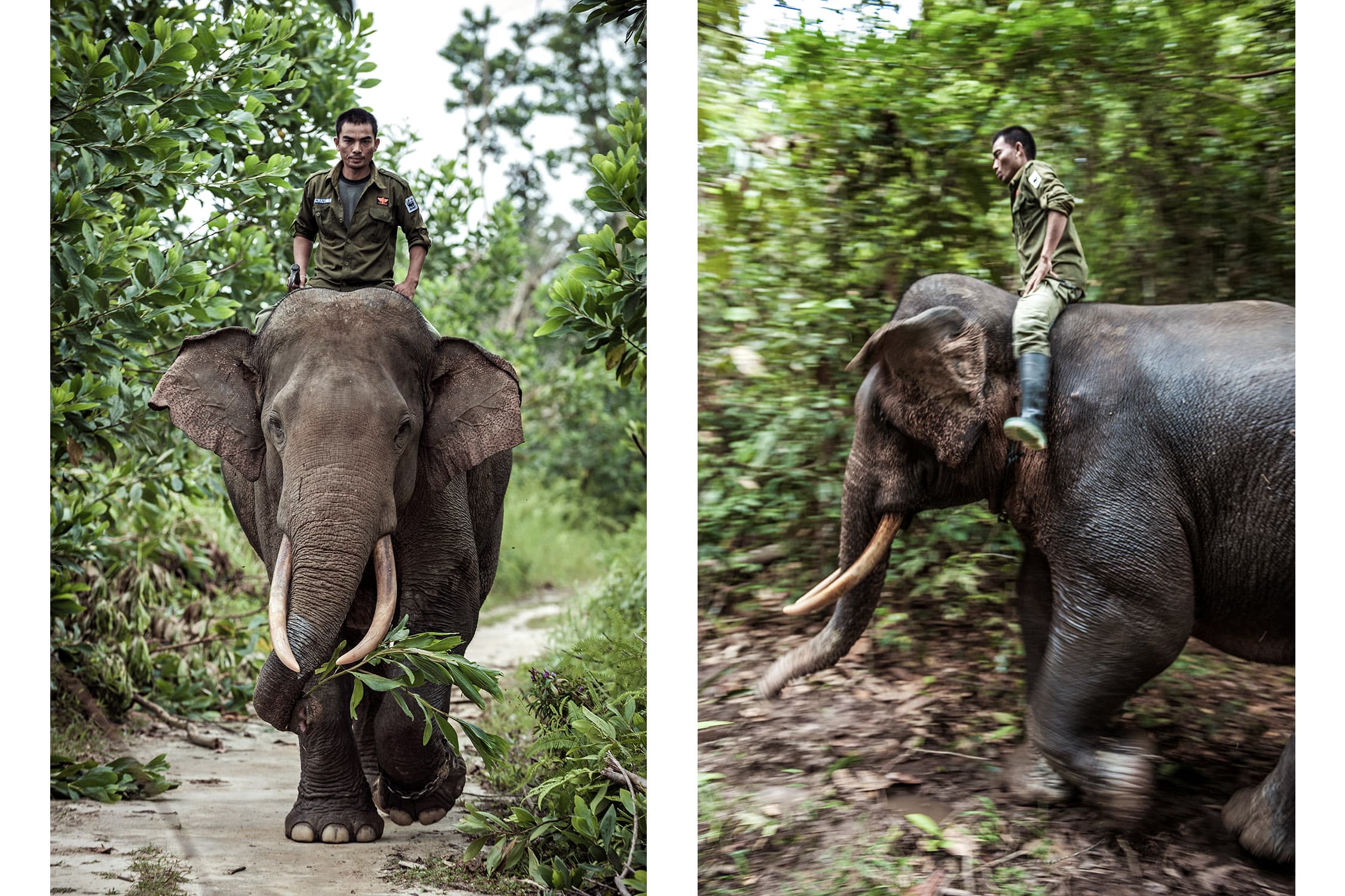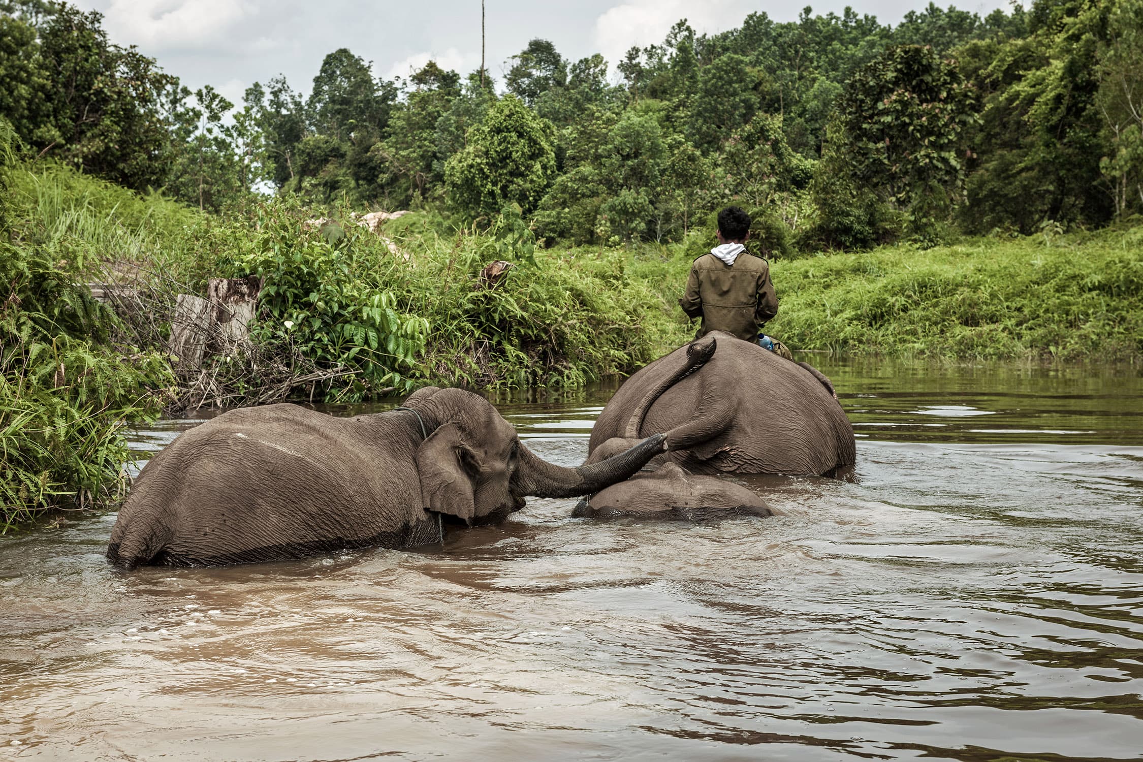Deep inside the Indonesian rainforest of central Sumatra lives the Tesso Nilo Elephant Flying Squad. This group of seven domesticated elephants and their 11 specially trained mahouts are operated by the World Wildlife Fund (WWF) in collaboration with Indonesia’s Ministry of Forestry. The squad’s mission is to provide a secure haven for Riau Province’s largest remaining wild elephant population. Elephant numbers have declined in Riau from more than 1,600 in 1985 to as few as 350 today, about 150 of which live in Tesso Nilo National Park. By patrolling the fringes of the park, the squad helps prevent wild elephants from invading farms and villages — where they can cause immense damage and run the risk of being injured or killed by angry farmers and villagers — by carefully driving them back into the jungle. The Elephant Flying Squad is in constant battle to bring harmony to the local environment by mitigating human-elephant conflict. And, so far, this supersize security patrol appears to be winning.